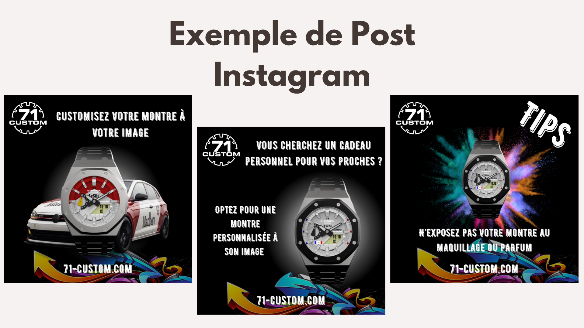 Le principal enjeu pour 71 Custom était d’accroître sa visibilité et de se démarquer dans un marché saturé par de nombreuses entreprises de customisation. Il s’agissait non seulement de créer une image de marque forte et cohérente, mais aussi d’attirer et de fidéliser une clientèle passionnée par les montres et les voitures personnalisées.