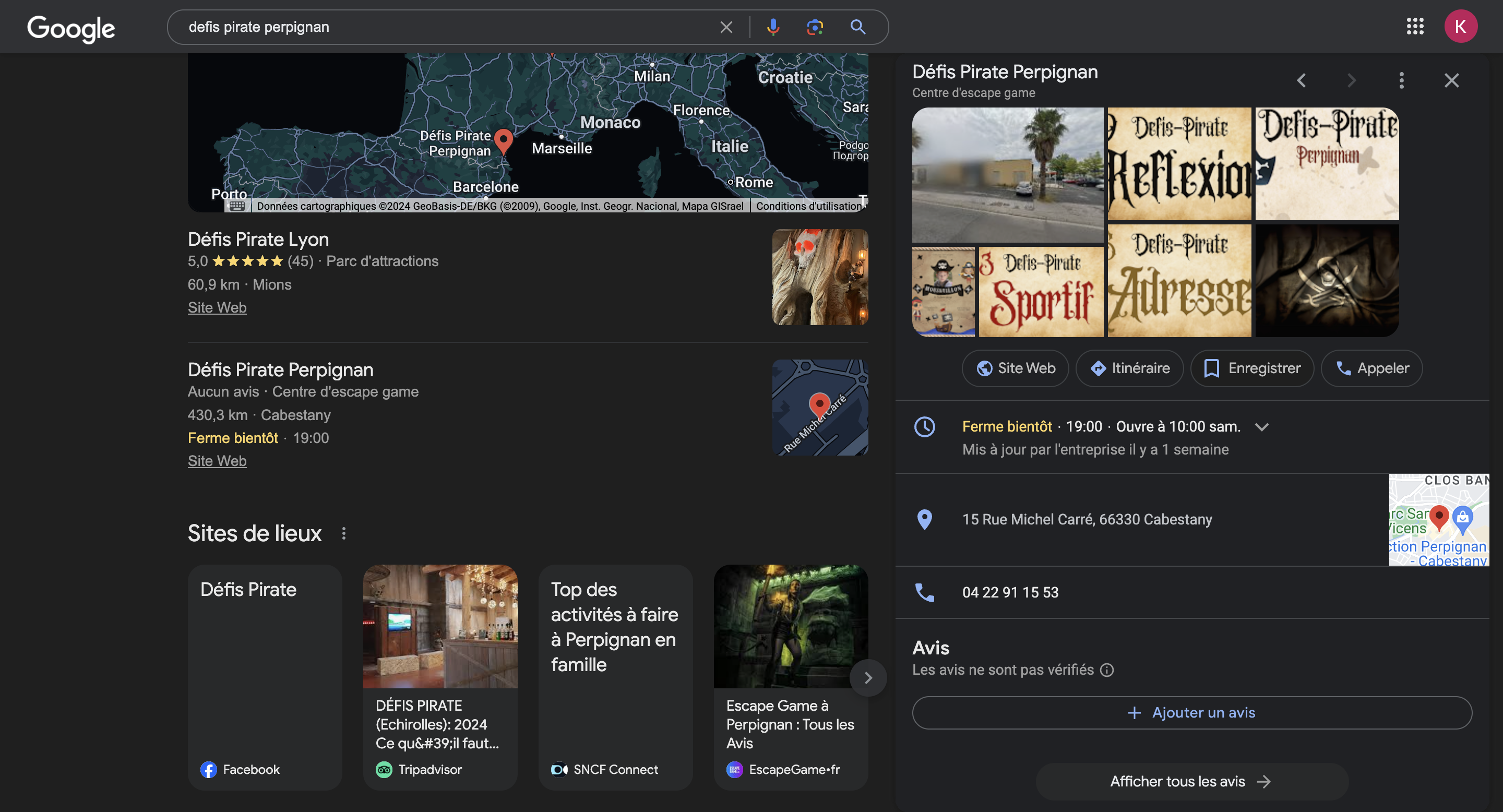 Défis Pirate est une entreprise spécialisée dans les escape games et action games, présente à Perpignan et Lyon, et en pleine expansion avec une nouvelle ouverture à Perpignan. Nous avons été contactés pour gérer cette nouvelle ouverture et envisager une refonte des sites existants à Lyon et Grenoble. Le projet impliquait la mise en œuvre d’un pack Starter+ pour la nouvelle ouverture, comprenant diverses actions pour assurer le succès de Défis Pirate à Perpignan.